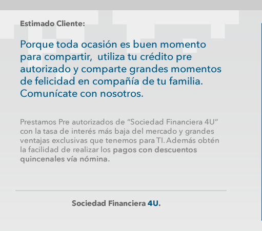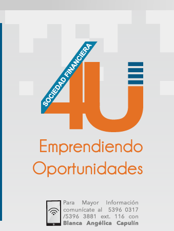 Costo Anual Total (CAT) 30% Comisión anual por apertura 0%. Servicios ofrecidos por Sociedad Financiera 4U S.A. de C.V.